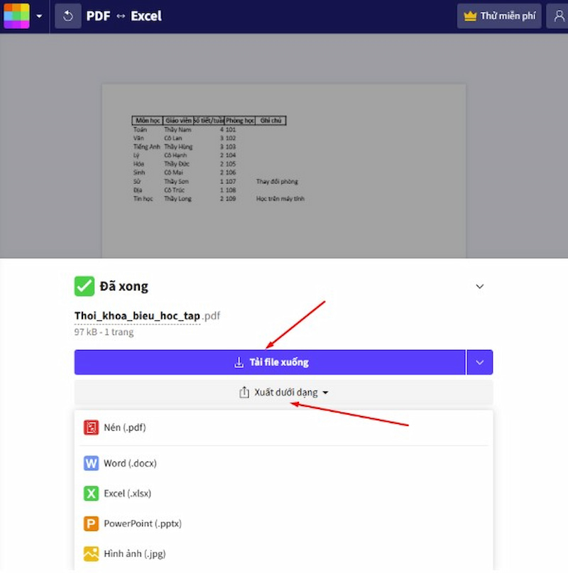 Bước 4: Nhấn “Tải file xuống”. Hoặc bạn có thể lựa chọn xuất dưới dạng khác .docx, .pptx, .jpg.