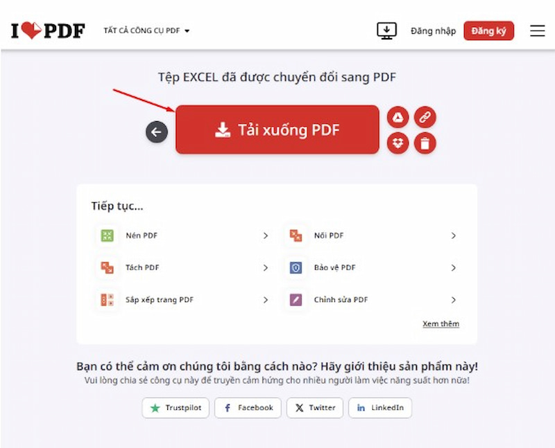 Bước 4: Sau khi tệp Excel đã được chuyển đổi sang PDF. Nhấn “Tải xuống PDF” về máy hoặc lưu vào Google Drive, Chia sẻ liên kết tải xuống hoặc quét QR, Lưu vào Dropbox.